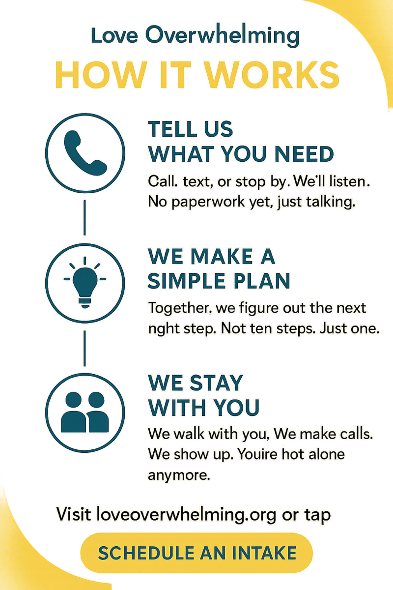 At Love Overwhelming, we are trained peer support and community health workers from right here in Cowlitz County. We understand the system and the streets through accountability, recovery, and now giving back to our community.